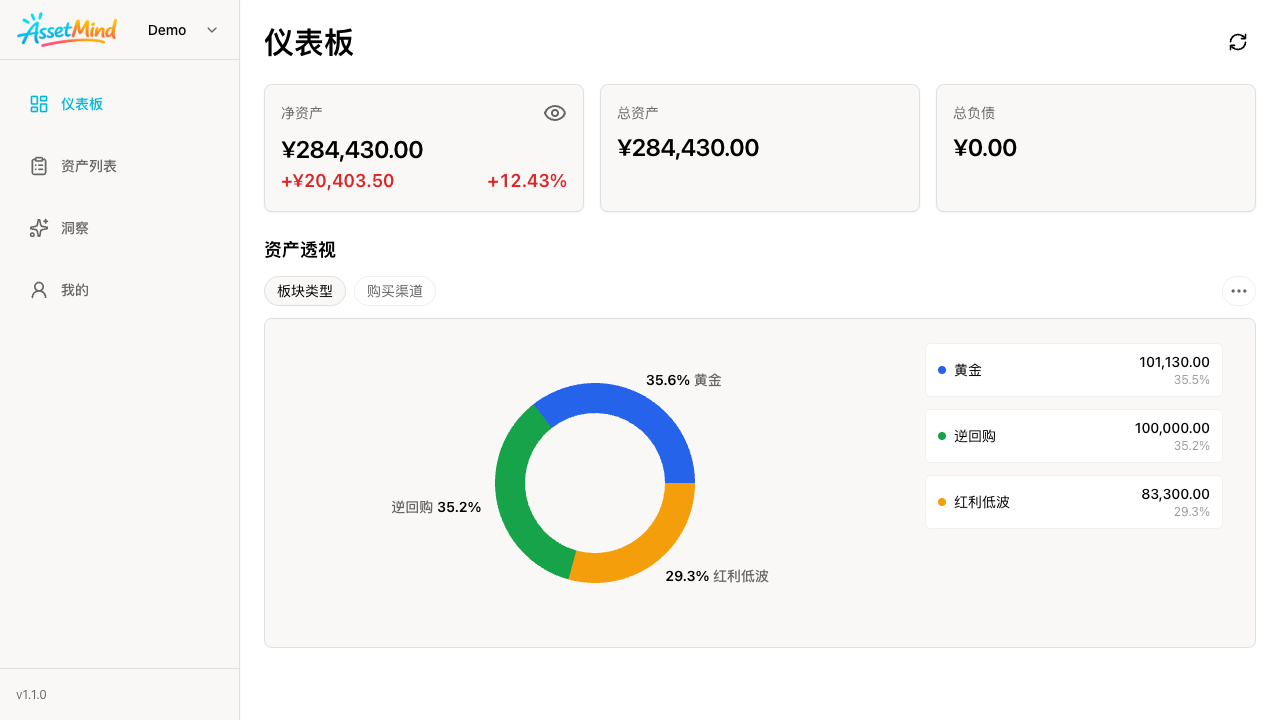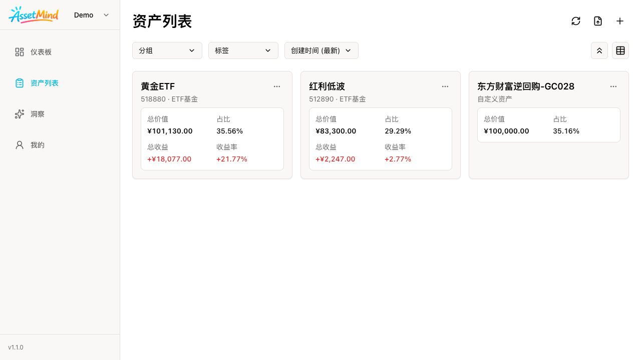 无论是基金、贵金属、银行账户,还是信用卡,AssetMind 将分散在各处的资产汇聚到同一个仪表板,随时掌握总资产价值与分布。