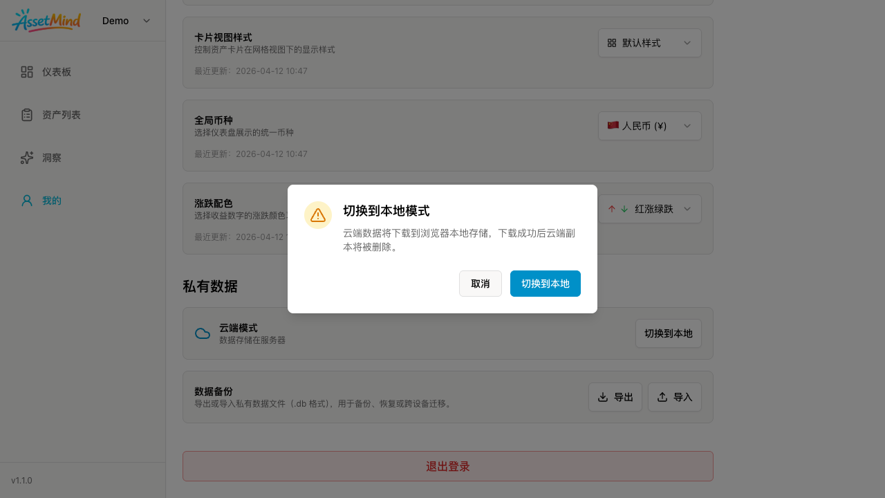 AssetMind 支持将投资数据存储在本地,无需上传至服务器。财务隐私完全由你掌控,安心使用。